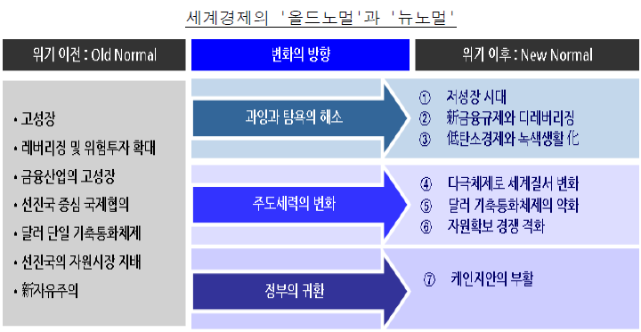 이러한 상황에 비추어 볼 때 '뉴 노멀'이란 그간 경제를 좌우하던 기존의 규칙들이 무너지고 새로운 원칙들이 정립되는 시대를 뜻하는 용어란 걸 알 수 있습니다.