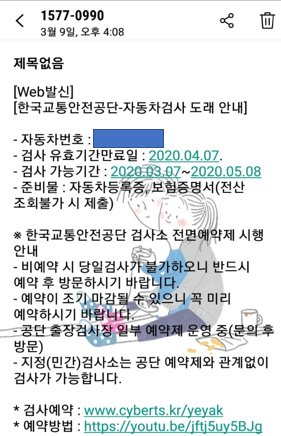 '교통안전공단'에서 정기점검 기간이 다 되었으니 방문하라는 문자를 받았거든요!! ㅎㅎ