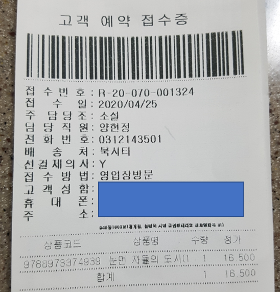 '눈먼 자들의 도시'는 '품절 상태'여서 집으로 배송 요청을 하였습니다.