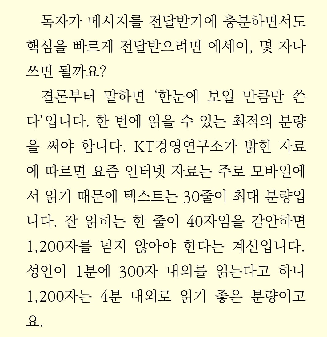 한 줄에 40자씩 30줄(총1200자)의 글이 독자가 4분 내외로 읽기 좋은 적절한 분량이다.
