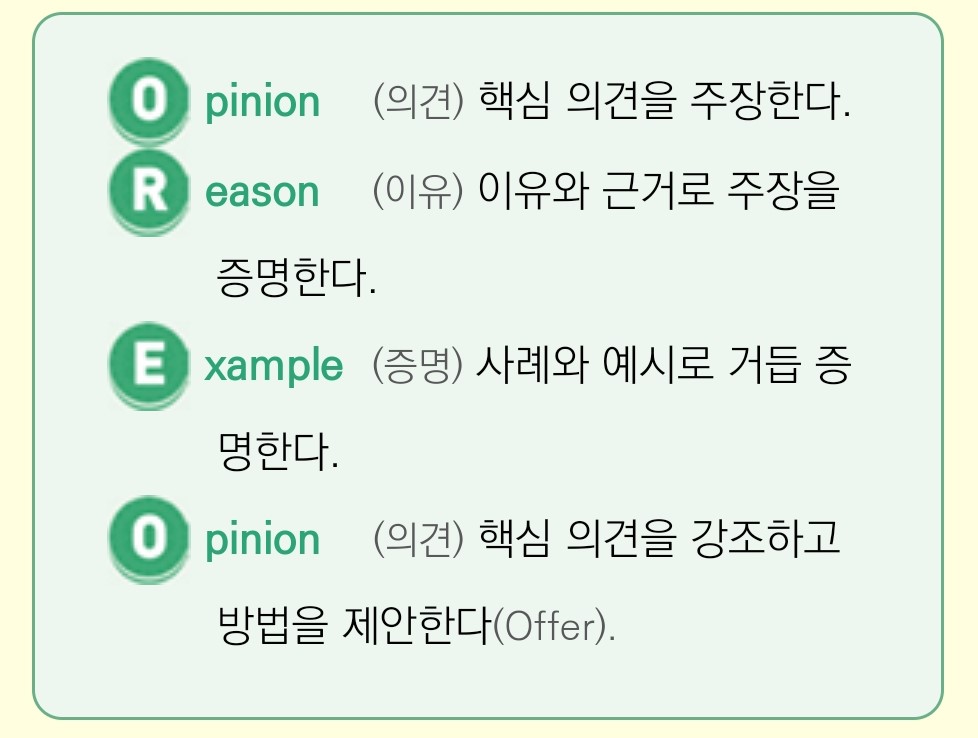 저자는 이 중요한 글을 쓰는 일에 있어서 ‘O.R.E.O map’이라는이라는 ‘글쓰기 도구’를 소개하는데 이는 글쓰기의 근간이 되는 개요에 해당하는 것이다. ‘Opinion – Reason – Example – Offer’의 흐름으로 구성된 이 도구는 글이 길을 잃지 않고 잘 정돈될 수 있도록 배치시키는 가이드라인 역할을 한다.