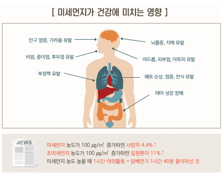 국제암연구소(IARC)에서는 미세먼지를 1군 발암물질로 지정했으며 이 밖에도 호흡기질환, 심혈관계 질환, 피부질환, 안구질환 및 면역력 저하 등에 영향을 미칠 수 있다고 합니다.