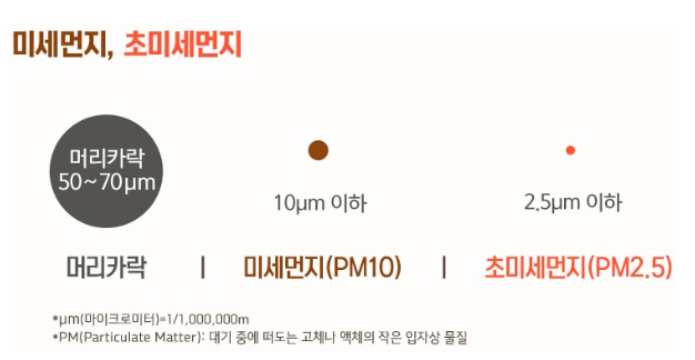 환경부에 의하면 사람의 머리카락 한 가닥 굵기를 약 50um로 봤을 때, 미세먼지인 PM10은 약 1/5크기인 10um보다 작은 크기의 먼지를 의미하고 초미세먼지는 약 1/20크기인 2.5um보다 작은 크기를 의미합니다.