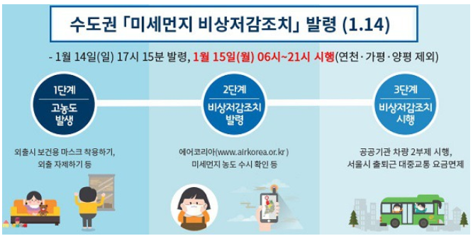 초미세먼지가 일정기간 지속될 경우, 단기간에 대기질을 개선하기 위해 시행되는 비상조치를 말합니다(2019.2.15~) 고농도 미세먼지 비상저감조치발령 시 배출가스 5등급 차량 운행 제안, 공사현장 비산먼지 발생억제조치, 어린이집 및 학교 휴교 및 수업시간 단축, 공공 기간 주차장 전면 폐쇄 및 차량 2부제를 시행합니다.