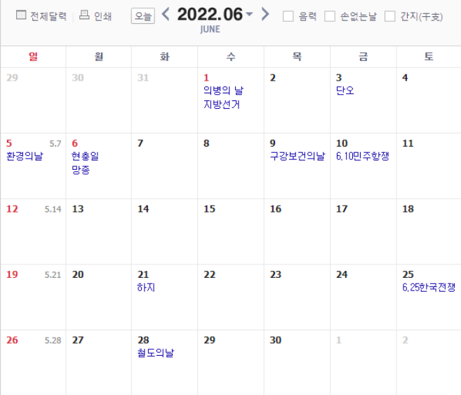 2022년 6월에는 총 2일의 공휴일이 있습니다. 바로 6월 1일(수) 전국동시지방선거일과 6월 6일(월) 현충일인데요. 따라서 6월 3일(목)과 6월 4일(금)에 연차를 2일 사용하면 수요일부터 월요일까지 총 6일간의 연휴를 만끽할 수 있습니다. 거의 일주일간 쉴 수 있으니 평상시보다 조금 더 긴 여행을 계획할 수도 있고 얼매나 좋게요~~~^.^