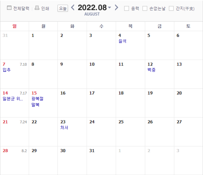 월에는 8월 15일 광복절이 유일한 공휴일인데요. 2022년 광복절은 월요일로 8월 12일(금) 혹은 8월 16일(화) 중에 연차를 하루 사용하면 4일간의 휴가를, 2일 모두 사용한다면 총 5일의 휴가를 즐길 수 있습니다.