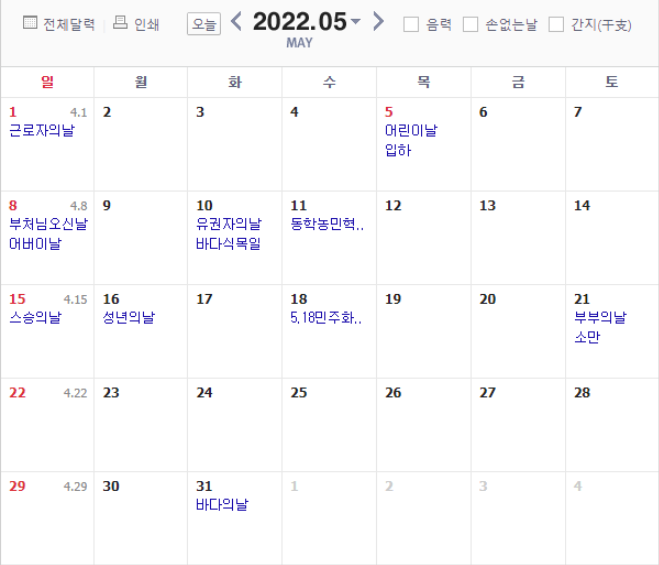 5월 1일인 근로자의 날과 5월 8일인 석가탄신일은 아쉽게도 모두 일요일인데요. (What the Fxxx!!!!!!!) 하지만 5월 5일 어린이날은 목요일로 5월 6일(금) 또는 5월 9일(월)에 연차를 사용하면 총 4일간 휴식을 즐길 수 있습니다.