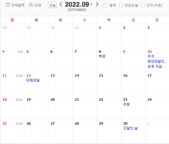 2022년에는 조금 이른 9월 9일(금)부터 대체 공휴일인 9월 12일(월)까지 총 4일간의 연휴가 예정되어 있는데요. 9월 8일(목)이나 9월 13일(화)에 연차를 사용할 경우 최소 5일 간의 휴식을 취할 수 있습니다. 만약 2일 모두 연차를 사용한다면 9월 8일(목)부터 9월 13일(화)까지 무려 6일의 휴가를 즐길 수 있습니다.