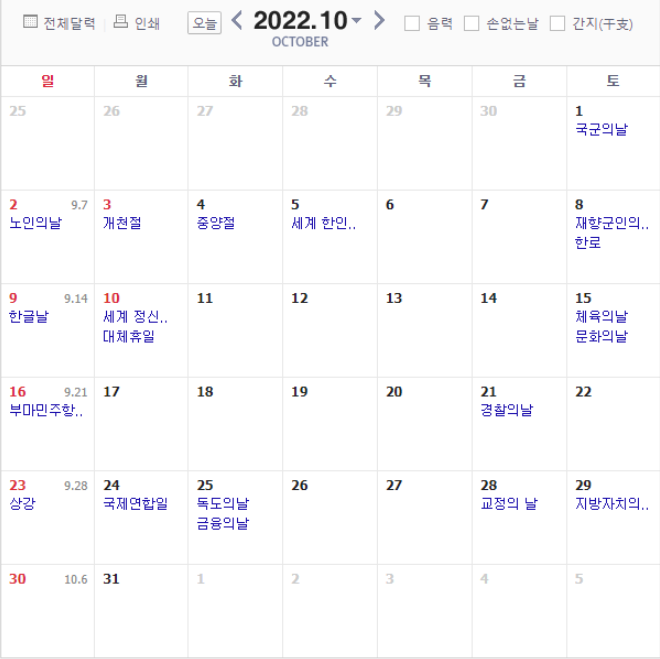 2022년 10월에는 10월 3일(월) 개천절과 한글날 대체 공휴일 10월 10일(월)이 기다리고 있습니다. 덕분에 주4일제를 잠시 맛볼 수 있습니다. (푸쳐핸썹!!!!!!)