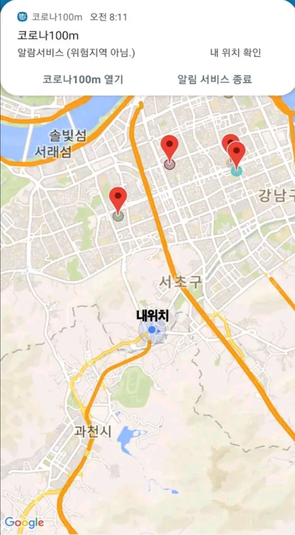 코로나19 확진자의 동선(또는 방문시설)이 내 주변 100m 거리에 들어오면 알림(푸시)을 띄워주는 어플리케이션입니다.