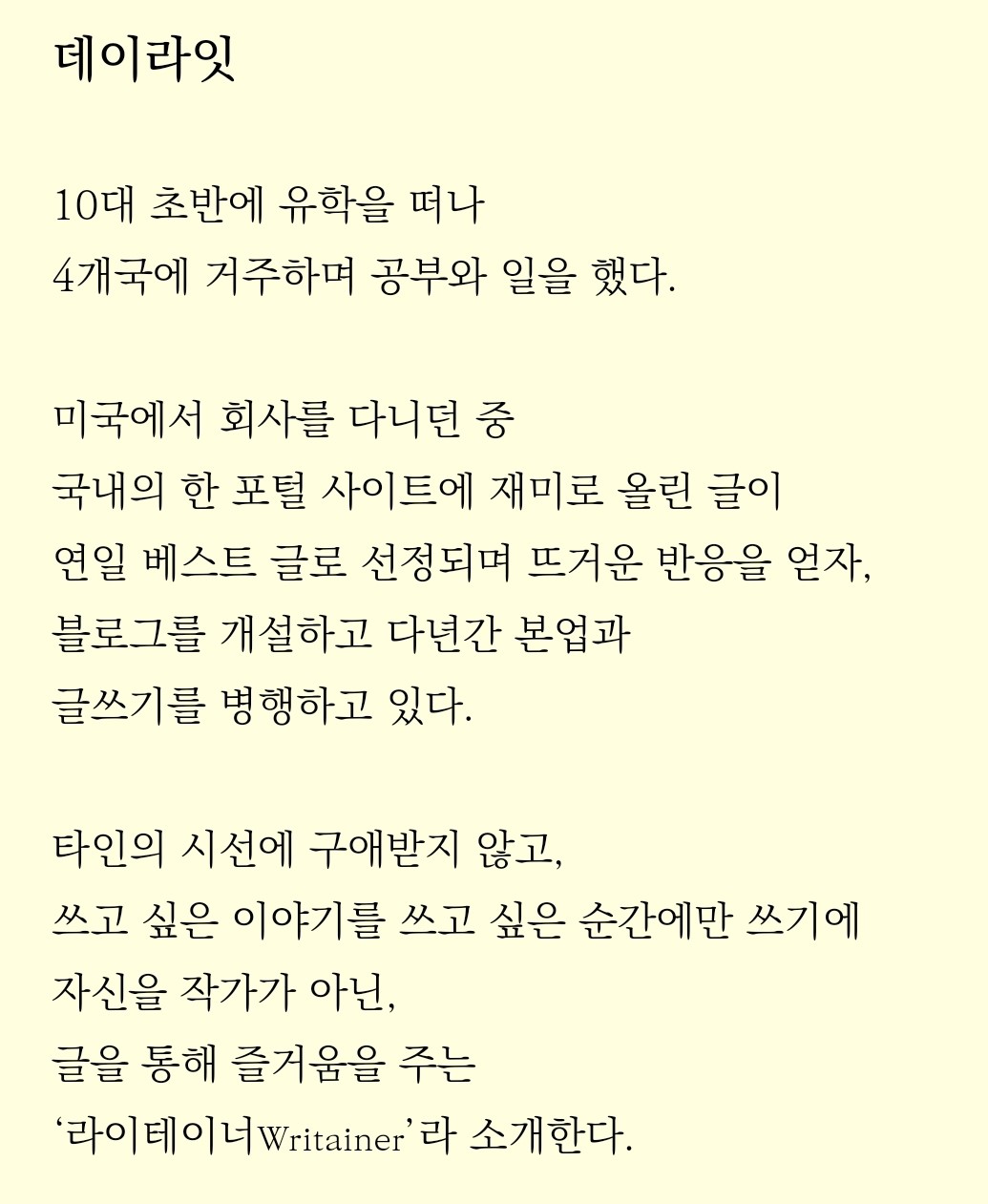 블로그 ‘데이라잇 Show_남자가 들려주는 진짜 남자 속마음 이야기’를 4년째 운영 중인 블로거. 유학생 시절 썸을 타던 여자와 관계가 깨져, 인터넷 게시판에 넋두리를 올리다 엉뚱하게도 폭발적인 조회수를 기록하자 블로그를 개설해 글을 연재하기로 작정했다.