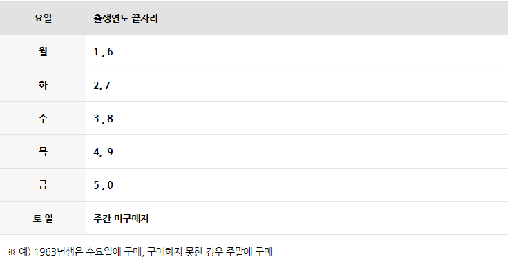 정부가 2020년 3월 5일 내놓은 '마스크 수급 안정화 대책'에 포함된 내용으로 2020년 3월 9일부터 시행됩니다. 내용은 출생연도 끝자리가 '1, 6'이면 월요일, '2, 7'은 화요일, '3, 8'은 수요일, '4, 9'는 목요일, '5, 0'은 금요일로 마스크를 살 수 있는 요일을 정한 것입니다. 예를 들어 출생연도가 1950년생인 경우 끝자리가 '0'이기 때문에 금요일, 1981년생은 '1'로 끝나기 때문에 월요일에 마스크 구매가 가능합니다.