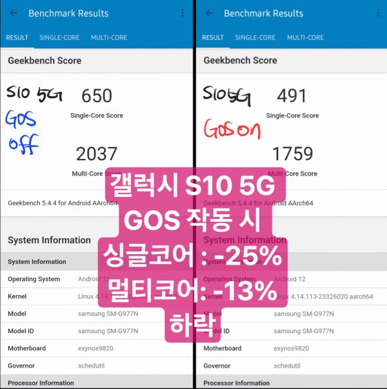 GOS기능이 탑재되어있는 갤럭시 S10 5G 모델을 가지고도 동일한 조건으로 실험을 진행해 본 결과 GOS ON/OFF에 따라 성능이 13~25%정도 떨어지는 현상이 확인되었습니다.